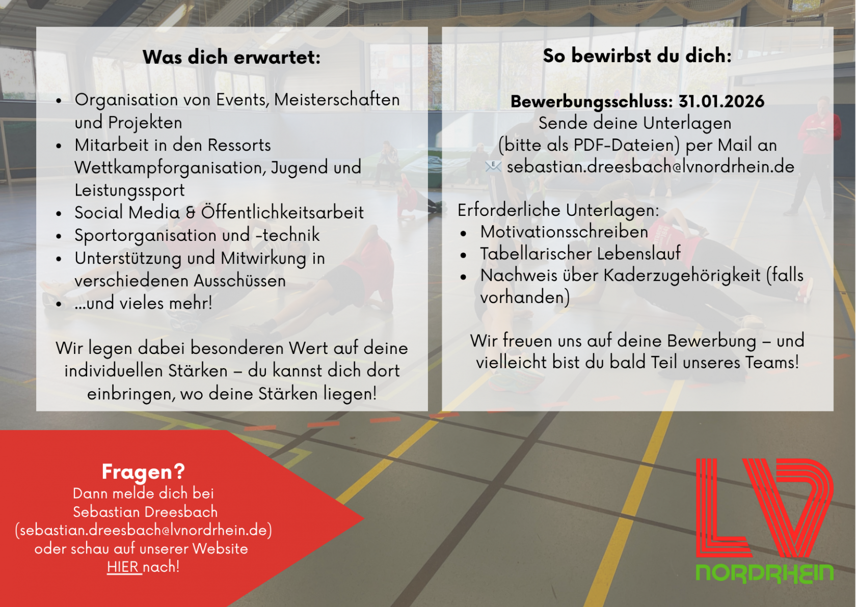 Der LVN freut sich auf engagierte Bewerberinnen und Bewerber, die Lust haben, die Leichtathletik in Nordrhein aktiv mitzugestalten.