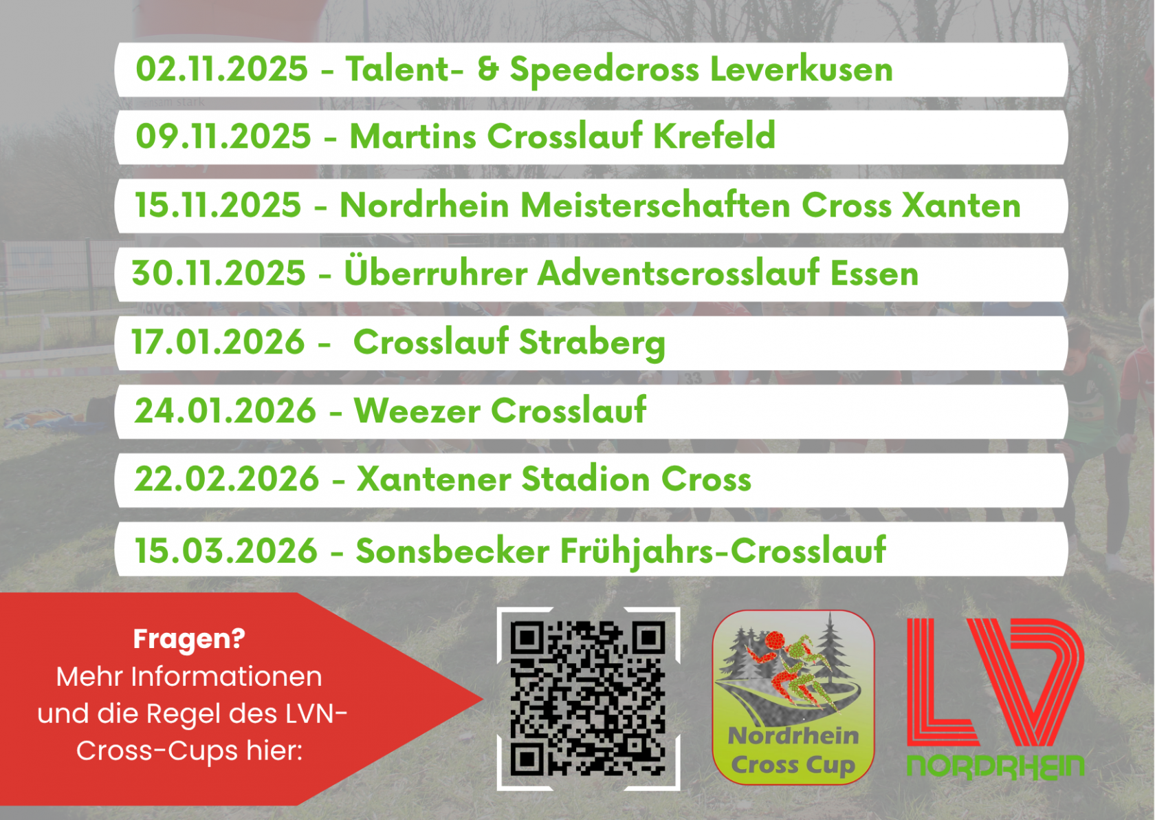 Bild: Bild: Nordrhein Cross Cup Donnerstag, 16. Januar 2025 12:30 LVN Cross Cup 2025 & 2026 - Sei dabei! Ausschreibung Ausschreibung Termine und Orte Veranstaltungen & Wertung Veranstaltungen Wertung